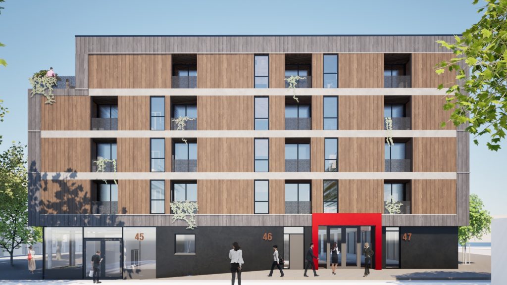 Die Obergeschosse des Gebäudes entstehen in nachhaltiger Holzbauweise, was sowohl eine besonders hohe Energieeffizienz als auch ein angenehmes Raumklima gewährleistet. Insgesamt 75 moderne und attraktiv gestaltete Mini-Apartments bieten zeitgemäßen Wohnkomfort. Die durchdachten Grundrisse sind unter anderem auf die Bedürfnisse von Senior:innen und mobilitätseingeschränkten Personen ausgerichtet. Damit erfüllt das Gebäude höchste Ansprüche an Wohnqualität und Nachhaltigkeit. Die Ausrichtung auf DGNB Gold und QNG Plus-Zertifizierungen garantiert höchste Effizienz und Zukunftsfähigkeit.